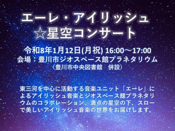 豊川市ジオスペース館では、次のとおり「エーレ・アイリッシュ☆星空コンサート」を開催します。 東三河を中心に活動する音楽ユニット「エーレ」によるアイリッシュ音楽とジオスペース館プラネタリウムのコラボレーション。満点の星空の…