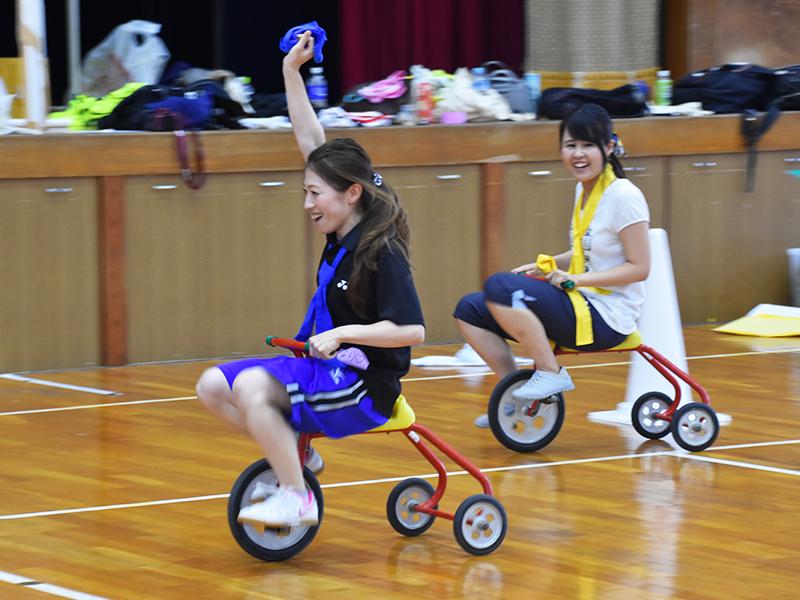 毎回内容を変えていますが、今回は2人3脚→3人4脚→三輪車→三輪車→ダッシュ×3で障害物リレーが行われました。